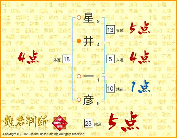 あなたの人生を表す1番重要な運勢です。生涯を通じて影響する総合運となり、主に50歳以降の晩年期に影響を及ぼします。苗字と名前の合計画数。