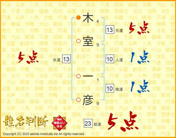 木室一彦さんの総運は23画の5点!