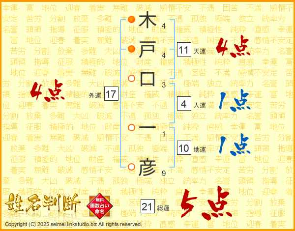 木(4画)戸(4画)口(3画) 一(1画)彦(9画)