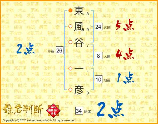 東(8画)風(9画)谷(7画) 一(1画)彦(9画)