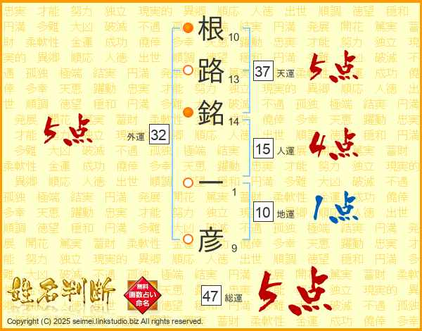 根(10画)路(13画)銘(14画) 一(1画)彦(9画)