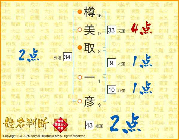 樽(16画)美(9画)取(8画) 一(1画)彦(9画)