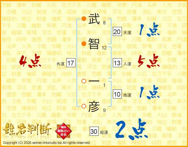 生活面を象徴する運勢です。外部から受ける影響力を表し、結婚運、家庭運や職場、環境への順応性を表します。総運から人運を引いた画数。姓や名が1文字の場合を除く。