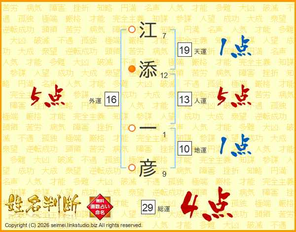 生活面を象徴する運勢です。外部から受ける影響力を表し、結婚運、家庭運や職場、環境への順応性を表します。総運から人運を引いた画数。姓や名が1文字の場合を除く。