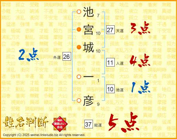池(7画)宮(10画)城(10画) 一(1画)彦(9画)