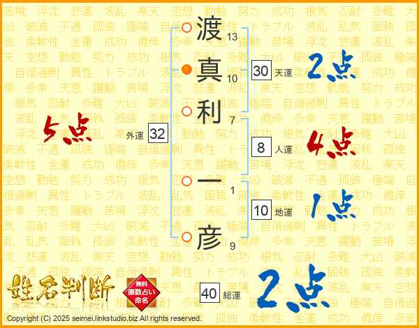 渡(13画)真(10画)利(7画) 一(1画)彦(9画)