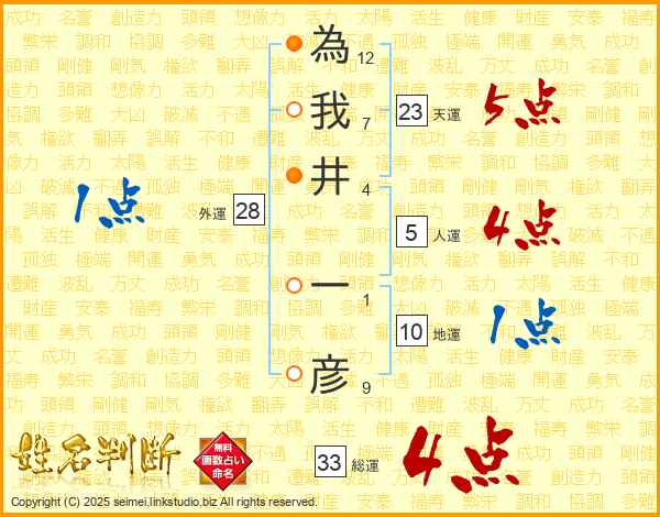 為(12画)我(7画)井(4画) 一(1画)彦(9画)
