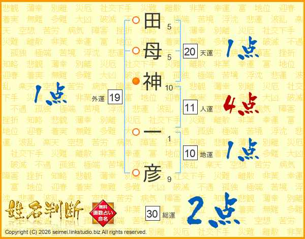 田(5画)母(5画)神(10画) 一(1画)彦(9画)