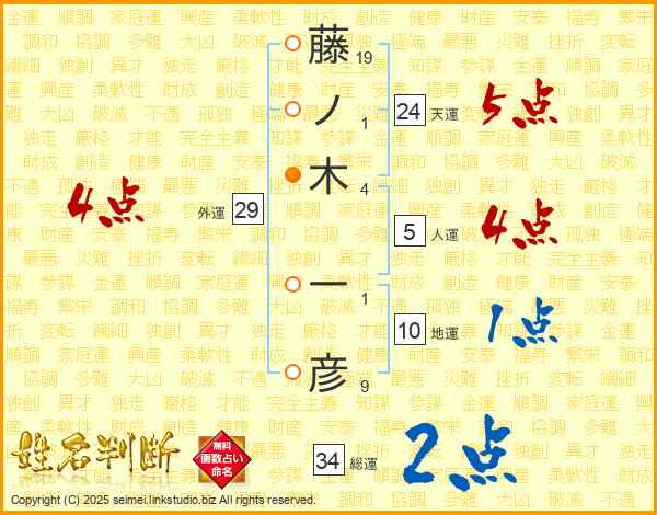藤(19画)ノ(1画)木(4画) 一(1画)彦(9画)