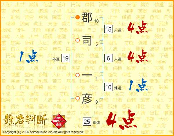 郡(10画)司(5画) 一(1画)彦(9画)
