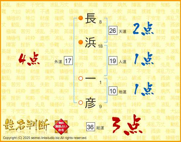 あなたの人生を表す1番重要な運勢です。生涯を通じて影響する総合運となり、主に50歳以降の晩年期に影響を及ぼします。苗字と名前の合計画数。