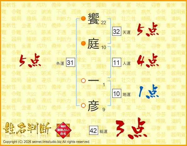 饗(22画)庭(10画) 一(1画)彦(9画)