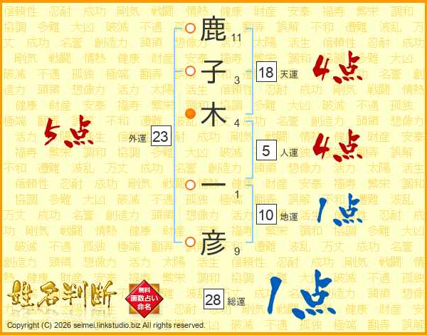 鹿(11画)子(3画)木(4画) 一(1画)彦(9画)