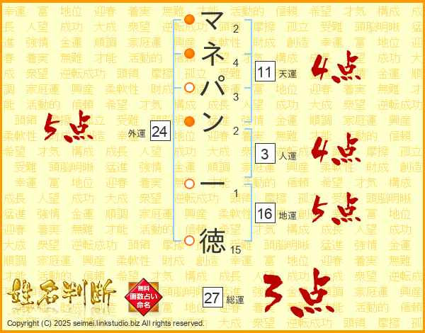 マ(2画)ネ(4画)パ(3画)ン(2画) 一(1画)徳(15画)