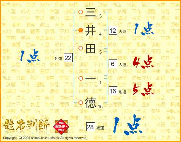 三(3画)井(4画)田(5画) 一(1画)徳(15画)