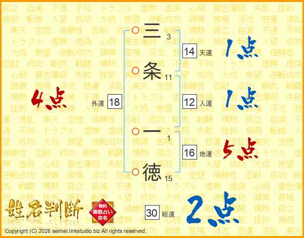 あなたの人生を表す1番重要な運勢です。生涯を通じて影響する総合運となり、主に50歳以降の晩年期に影響を及ぼします。苗字と名前の合計画数。