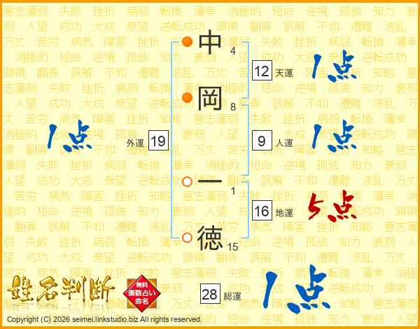生活面を象徴する運勢です。外部から受ける影響力を表し、結婚運、家庭運や職場、環境への順応性を表します。総運から人運を引いた画数。姓や名が1文字の場合を除く。