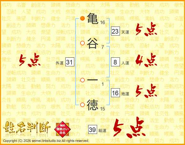 亀(16画)谷(7画) 一(1画)徳(15画)