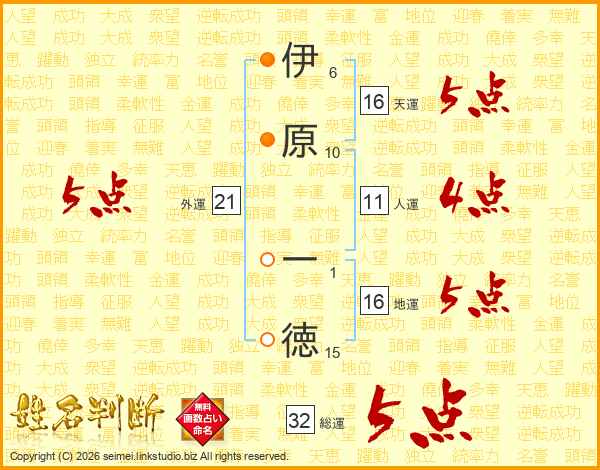 あなたの人生を表す1番重要な運勢です。生涯を通じて影響する総合運となり、主に50歳以降の晩年期に影響を及ぼします。苗字と名前の合計画数。