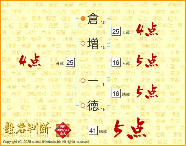 生活面を象徴する運勢です。外部から受ける影響力を表し、結婚運、家庭運や職場、環境への順応性を表します。総運から人運を引いた画数。姓や名が1文字の場合を除く。