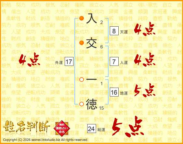 生活面を象徴する運勢です。外部から受ける影響力を表し、結婚運、家庭運や職場、環境への順応性を表します。総運から人運を引いた画数。姓や名が1文字の場合を除く。
