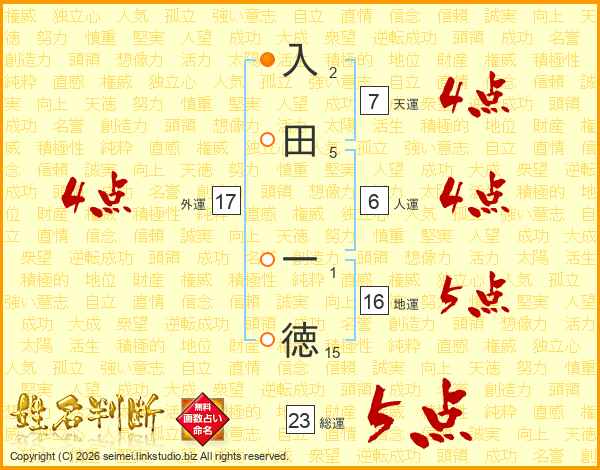 生活面を象徴する運勢です。外部から受ける影響力を表し、結婚運、家庭運や職場、環境への順応性を表します。総運から人運を引いた画数。姓や名が1文字の場合を除く。