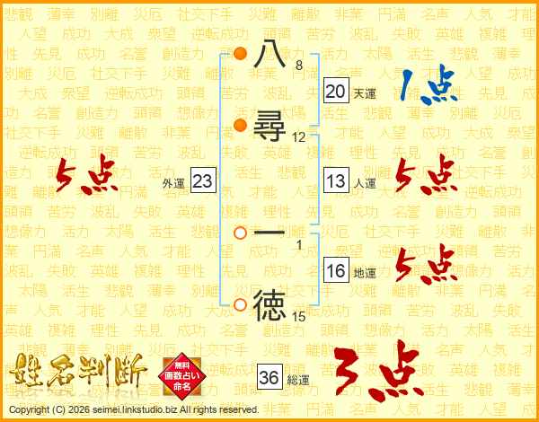 生活面を象徴する運勢です。外部から受ける影響力を表し、結婚運、家庭運や職場、環境への順応性を表します。総運から人運を引いた画数。姓や名が1文字の場合を除く。
