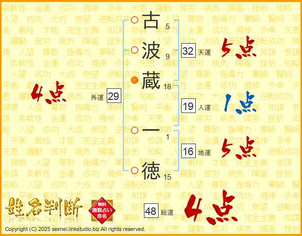 古(5画)波(9画)蔵(18画) 一(1画)徳(15画)