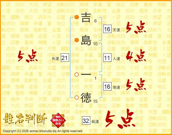 吉島一徳さんの総運は32画の5点!