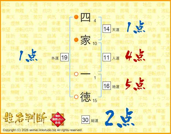 生活面を象徴する運勢です。外部から受ける影響力を表し、結婚運、家庭運や職場、環境への順応性を表します。総運から人運を引いた画数。姓や名が1文字の場合を除く。