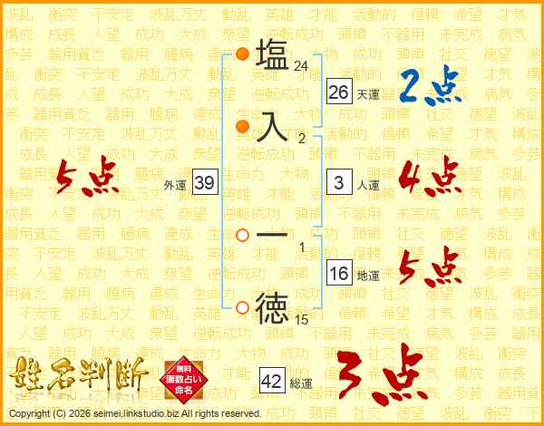 塩(24画)入(2画) 一(1画)徳(15画)