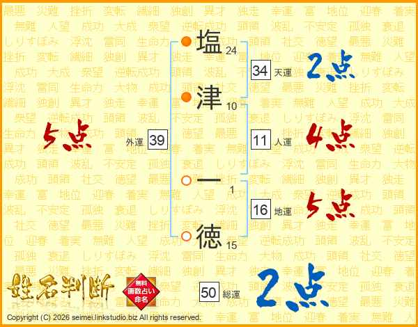 塩(24画)津(10画) 一(1画)徳(15画)