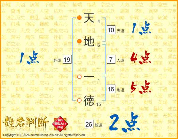 生活面を象徴する運勢です。外部から受ける影響力を表し、結婚運、家庭運や職場、環境への順応性を表します。総運から人運を引いた画数。姓や名が1文字の場合を除く。