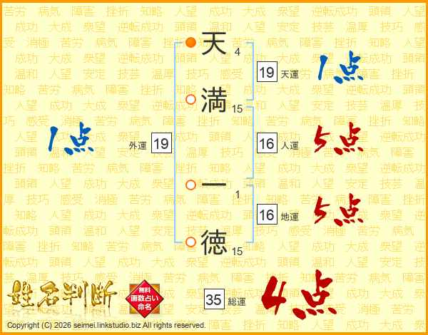 天(4画)満(15画) 一(1画)徳(15画)
