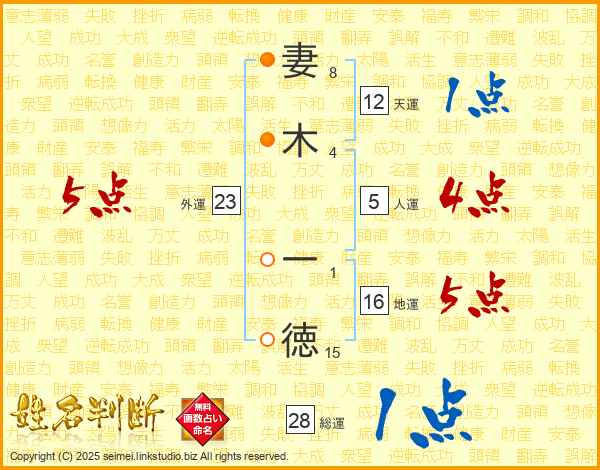 生活面を象徴する運勢です。外部から受ける影響力を表し、結婚運、家庭運や職場、環境への順応性を表します。総運から人運を引いた画数。姓や名が1文字の場合を除く。