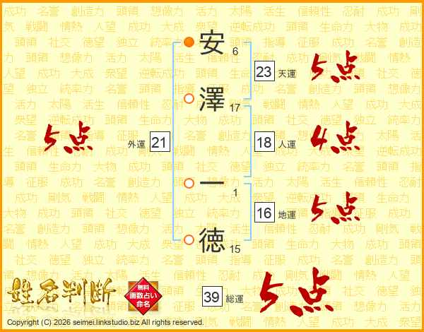生活面を象徴する運勢です。外部から受ける影響力を表し、結婚運、家庭運や職場、環境への順応性を表します。総運から人運を引いた画数。姓や名が1文字の場合を除く。
