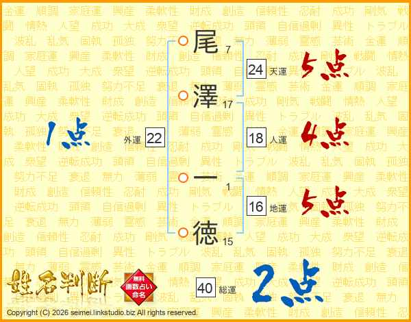 尾(7画)澤(17画) 一(1画)徳(15画)