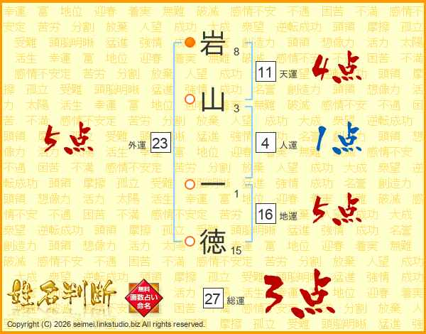 岩(8画)山(3画) 一(1画)徳(15画)