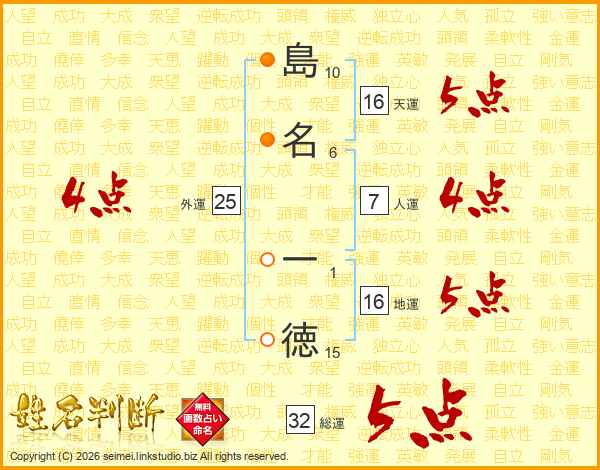 生活面を象徴する運勢です。外部から受ける影響力を表し、結婚運、家庭運や職場、環境への順応性を表します。総運から人運を引いた画数。姓や名が1文字の場合を除く。