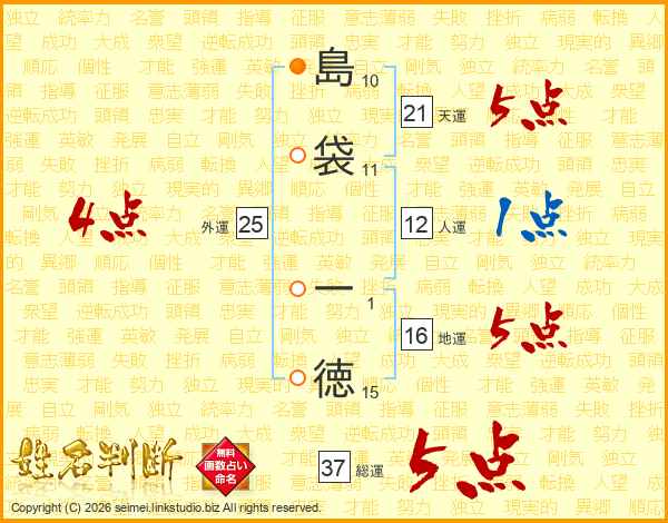 島(10画)袋(11画) 一(1画)徳(15画)