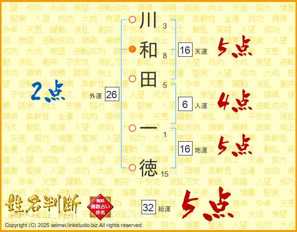 川(3画)和(8画)田(5画) 一(1画)徳(15画)