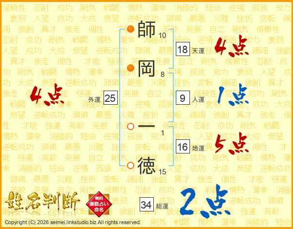 生活面を象徴する運勢です。外部から受ける影響力を表し、結婚運、家庭運や職場、環境への順応性を表します。総運から人運を引いた画数。姓や名が1文字の場合を除く。
