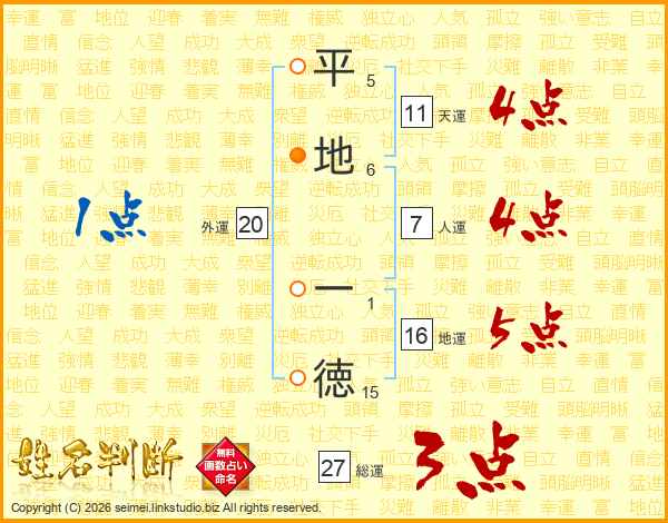 生活面を象徴する運勢です。外部から受ける影響力を表し、結婚運、家庭運や職場、環境への順応性を表します。総運から人運を引いた画数。姓や名が1文字の場合を除く。