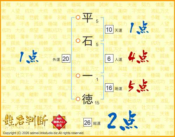 生活面を象徴する運勢です。外部から受ける影響力を表し、結婚運、家庭運や職場、環境への順応性を表します。総運から人運を引いた画数。姓や名が1文字の場合を除く。