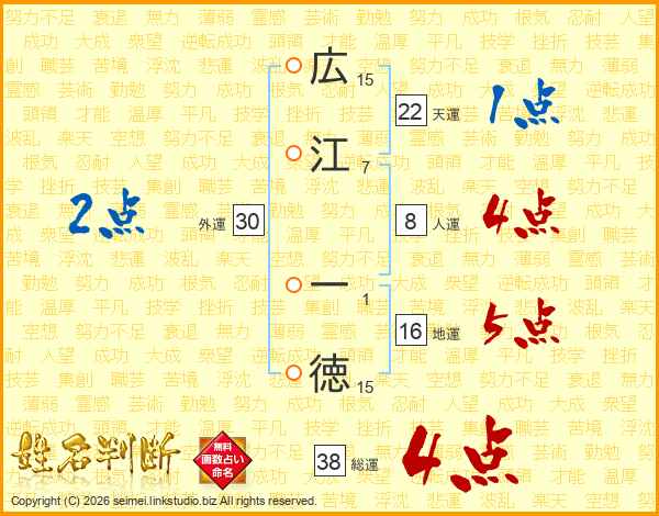 生活面を象徴する運勢です。外部から受ける影響力を表し、結婚運、家庭運や職場、環境への順応性を表します。総運から人運を引いた画数。姓や名が1文字の場合を除く。