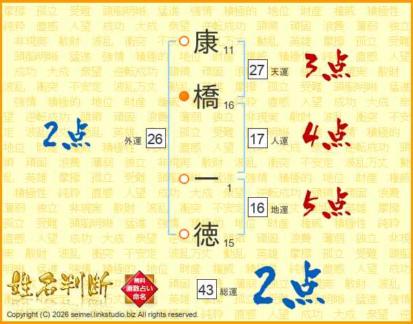 康橋一徳さんの総運は43画の2点!