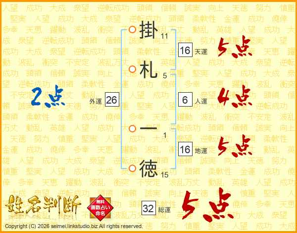 生活面を象徴する運勢です。外部から受ける影響力を表し、結婚運、家庭運や職場、環境への順応性を表します。総運から人運を引いた画数。姓や名が1文字の場合を除く。