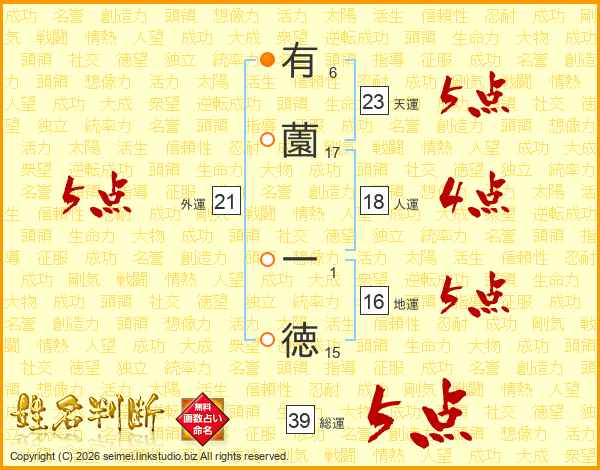 有薗一徳さんの総運は39画の5点!