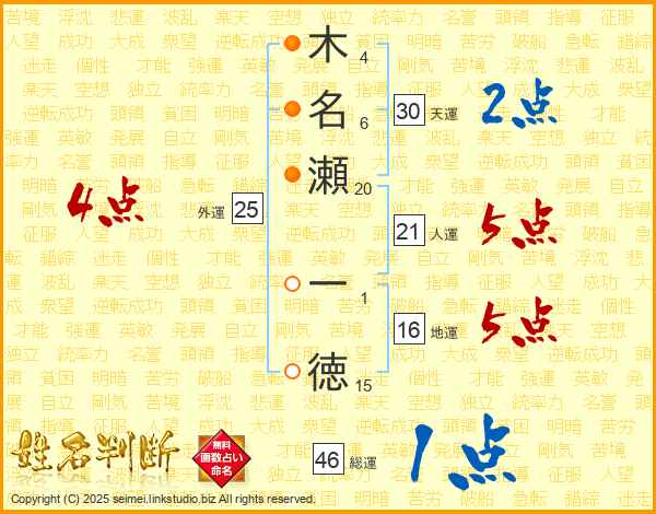 木(4画)名(6画)瀬(20画) 一(1画)徳(15画)