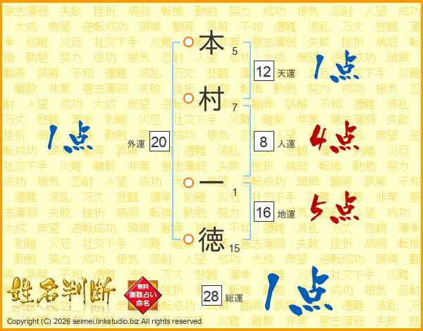 生活面を象徴する運勢です。外部から受ける影響力を表し、結婚運、家庭運や職場、環境への順応性を表します。総運から人運を引いた画数。姓や名が1文字の場合を除く。